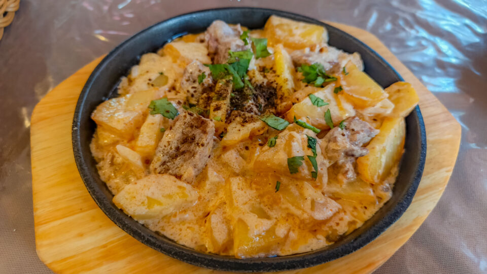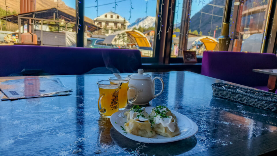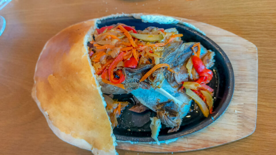 В кафе Маяк на поляне Нарзанов пробовали шашлык и жалбаур. Жалбаур из печени барана обёрнутой в бараний сальник(жировая сетка вокруг внутренних органов) здесь нам понравился.