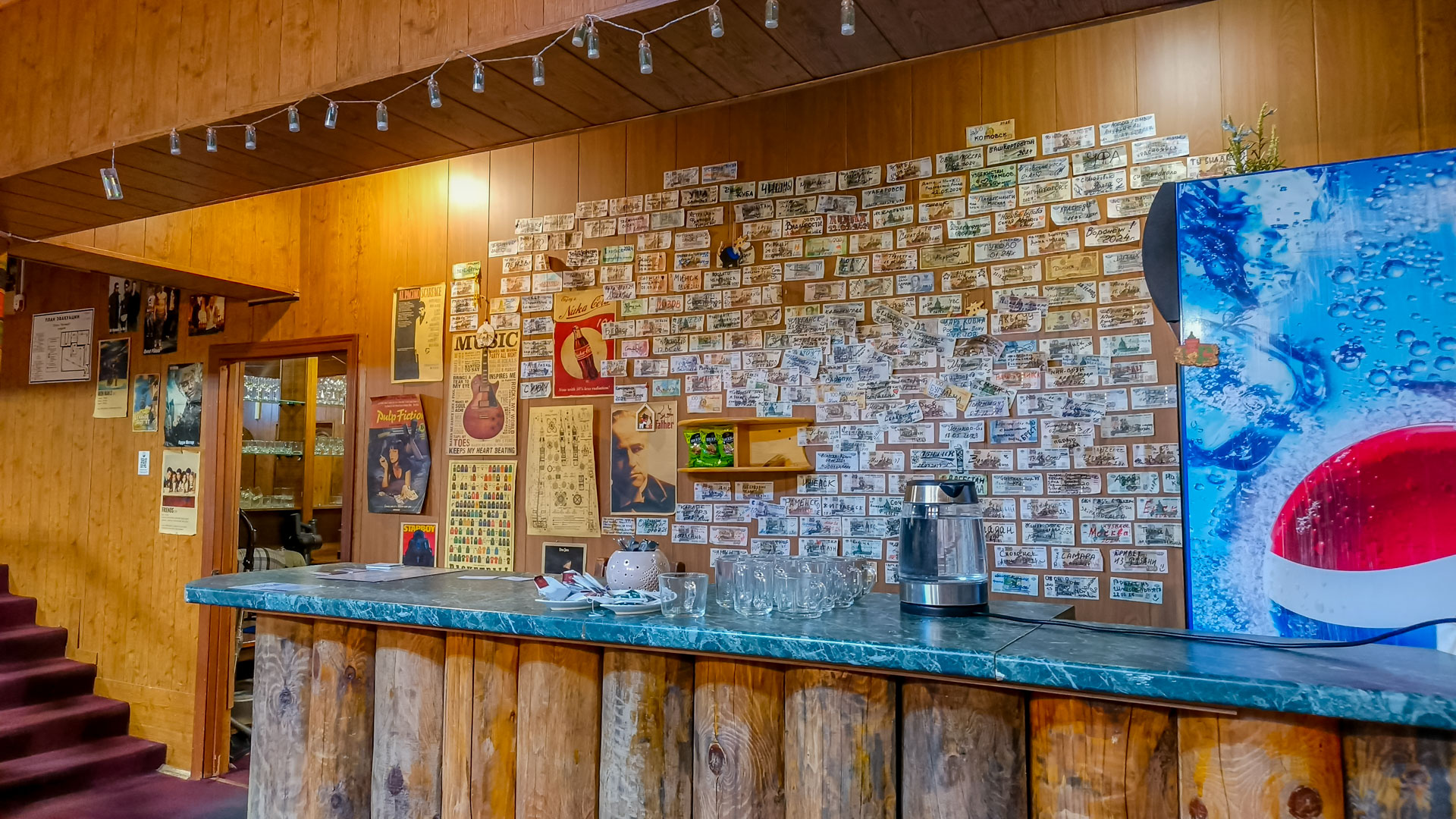 Барная стойка с купюрами, с названием городов откуда постояльцы