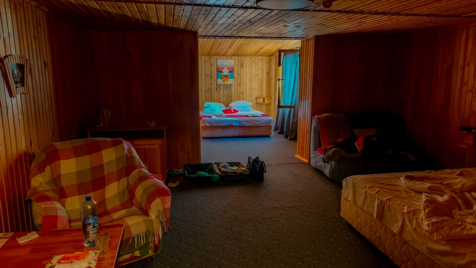В прошлый раз мы были в отеле Сказка, а этот рядом. И похоже тот же владелец. Нас заселили в семейный двух комнатный номер, несмотря на то что бронировали другой)